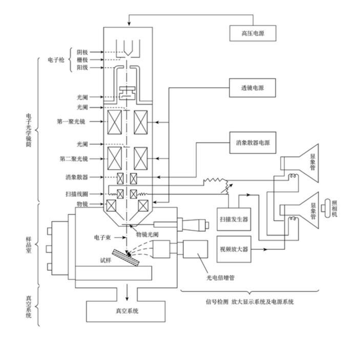 從結構上看,如圖2所示,掃描電子顯微鏡主要由七大系統組成,即電子光學系統、檢測、信號處理、顯示系統、圖像記錄系統、樣品室、真空系統、冷卻循環供水系統、供電系統。